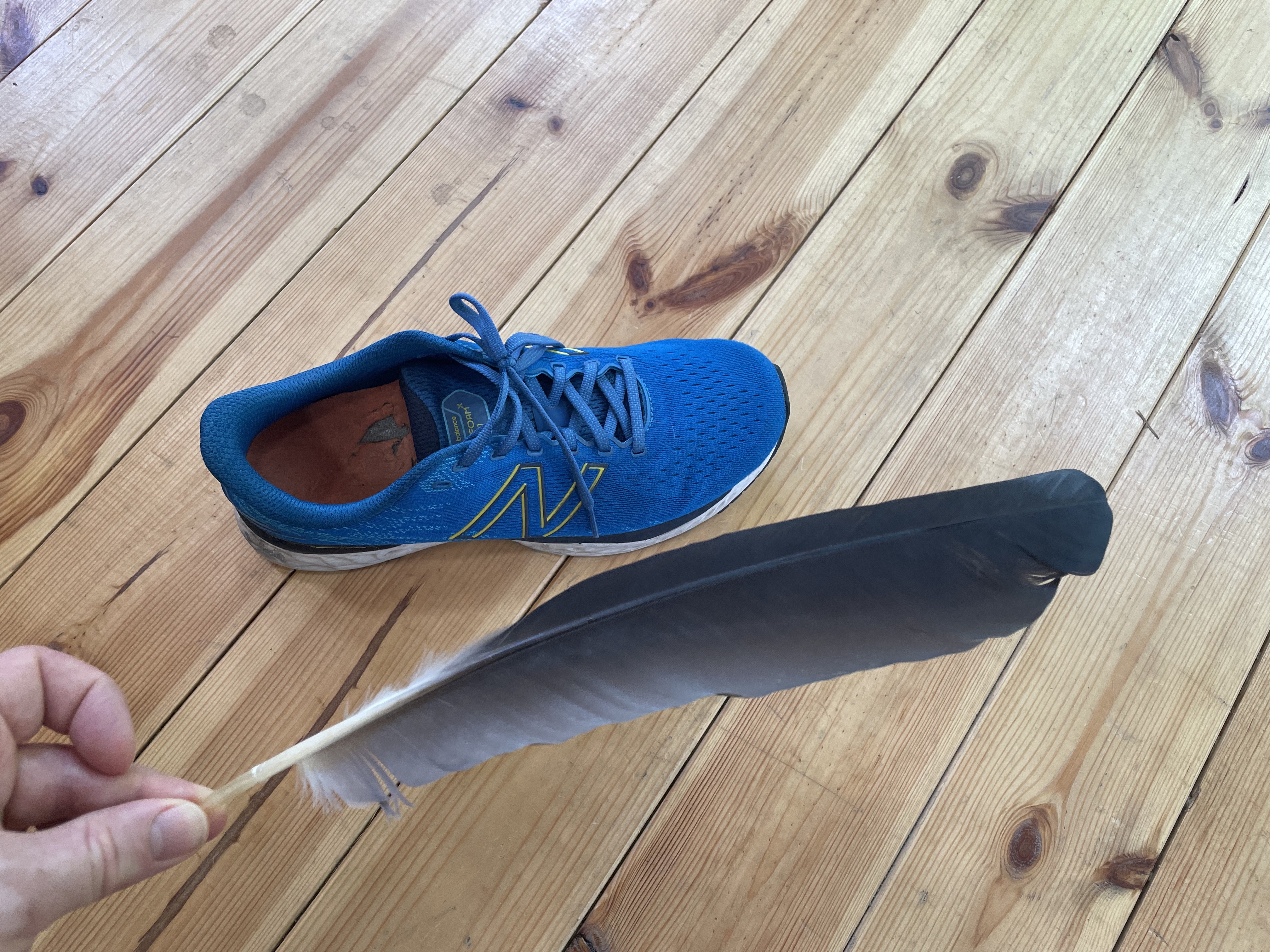 I was surprised to find this gargantuan feather in my garden. There are no birds sporting feathers that big to be found here, unless there’s an ostrich hiding somewhere. I assume it was shed from a passing heron, or was carried in by crows, who have a habit of collecting random things. The trainer is included as a point of comparison.